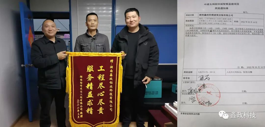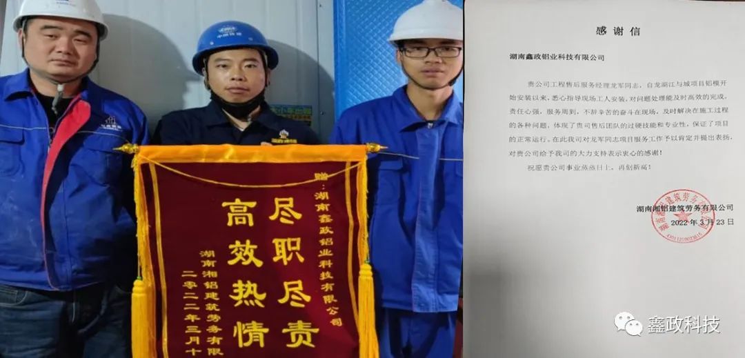 榮譽源自信任,信任源自擔當。錦旗既是對鑫政集團的鼓勵也是一種鞭策,集團未來將繼續(xù)以優(yōu)質服務貫穿始終,以客戶需求為導向,以客戶滿意為目標,進一步完善現(xiàn)場技術服務體系,提升技術服務人員專業(yè)能力,切實保障項目進度高效執(zhí)行,讓客戶樂享“鑫”服務,為客戶創(chuàng)造“鑫”價值,與客戶共創(chuàng)“鑫”輝煌。